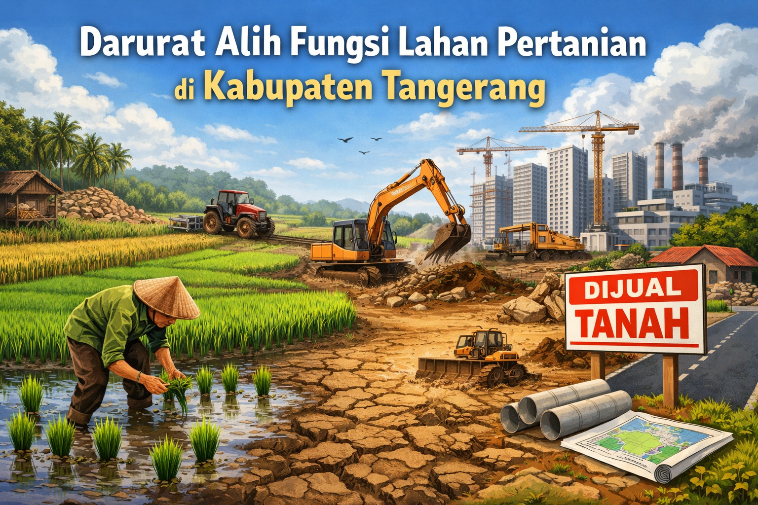 BantenNet, OPINI – Alih fungsi lahan pertanian di Kabupaten Tangerang kini semakin mengkhawatirkan. Lahan-lahan pertanian produktif secara masif dikonversi menjadi kawasan permukiman, industri, dan properti komersial. Fenomena ini paling menonjol terjadi di wilayah Tangerang Utara, yang selama ini dikenal sebagai salah satu kantong produksi pangan di Kabupaten Tangerang.