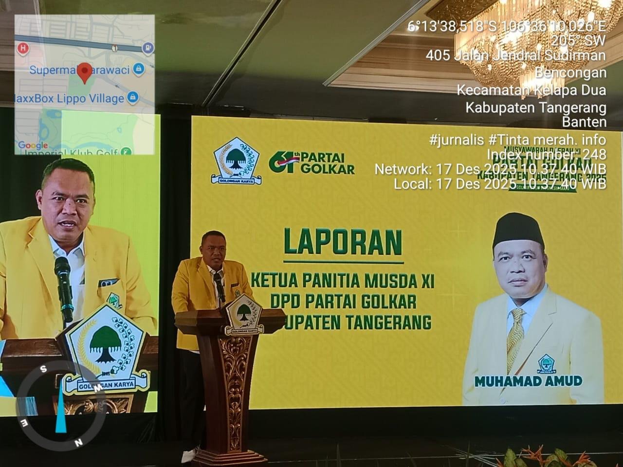 BantenNet, TANGERANG — Musyawarah Daerah ( Musda) Ke XI Partai Golkar digelar di Hotel Aryaduta Lippo Karawaci Kecamatan Kelapa Dua Kabupaten Tangerang, Rabu (17/12/2025), acara yang dihadiri oleh ketua DPD I Golkar Provinsi Banten H Andika Harzumi ini berjalan lancar, selain itu hadir juga Staf Ahli Bupati Tangerang Aji Jauhardhi mewakili Bupati Tangerang yang berhalangan hadir ,Ketua DPD Golkar DKI Jakarta DR H Ahmed Zaki Iskandar, Ketua DPRD Golkar Provinsi Banten Fahmi Hakim, tokoh Golkar Kabupaten Tangerang Ebi Jauhari H Topik, H Ahmad Jaini , H Hermawan, Endang Sudjana, Ketua PLT Golkar Kabupaten Tangerang H Muhamad Faisal, Anggota DPR RI Dari Fraksi Partai Golkar H Andi Ahmad Dara, dan Muzakir Juhri serta para ketua DPD Demokrat Muhamad Nawa Said Dimyati, Sekretaris DPC Gerindra H Izul Muluk, Ketua DPC Partai Persatuan Pembangunan H Didin Tohirudin, Ketua DPC PAN Sri Panggung Lestari, Ketua DPD PKS , Ketua DPC PKB Nurholis, Ketua DPD NasDem, Yakub Ikraman.