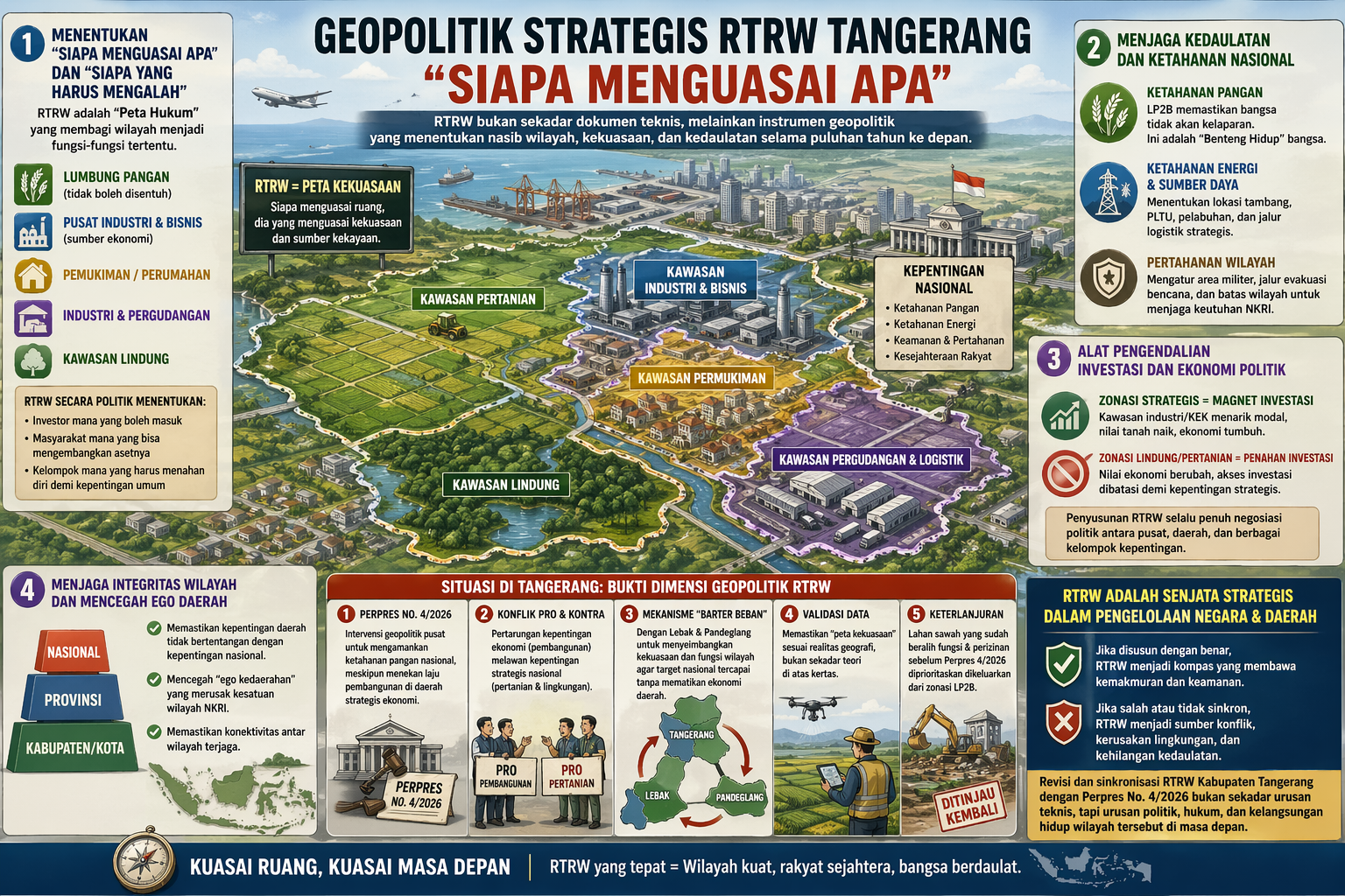Oleh karena itu, revisi dan sinkronisasi RTRW Kabupaten Tangerang dengan Perpres No. 4/2026 bukan sekadar urusan teknis, tapi urusan politik, hukum, dan kelangsungan hidup wilayah tersebut di masa depan.
