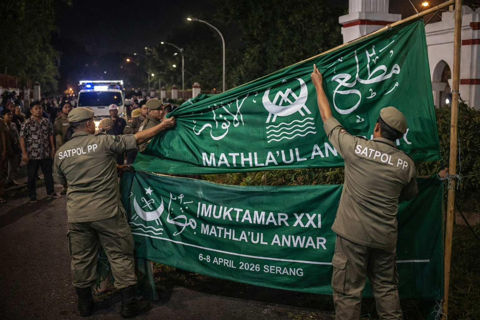 Penurunan atribut milik organisasi Mathlaul Anwar oleh Satuan Polisi Pamong Praja (Satpol PP) Kota Serang pada Selasa malam (7/4/2026) memicu polemik di tengah masyarakat. Tindakan tersebut dilakukan terhadap bendera dan banner Muktamar XXI Mathlaul Anwar yang terpasang di kawasan KP3B.( dok.foto: BantenNet/AI)